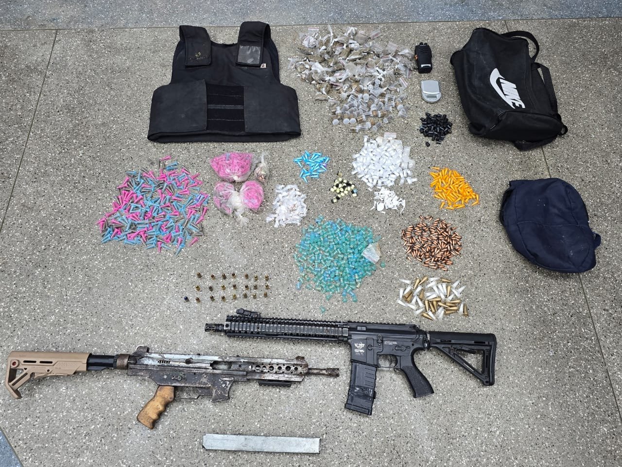 Na ação, foram apreendidos uma submetralhadora calibre 9mm, um simulacro de fuzil M4, 22 munições calibre 9mm, um colete balístico, 145 porções de maconha, 318 pinos de crack, 435 pinos de cocaína, 396 pinos de K9, um rádio comunicador, um aparelho celular e duas sacolas.
