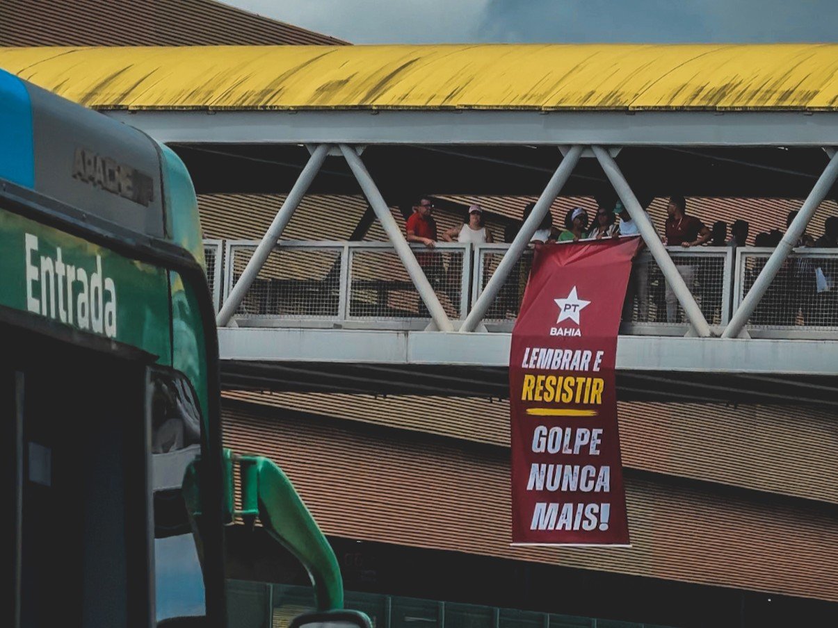 O PT Bahia realizou uma intervenção urbana na região do Iguatemi, nesta quinta-feira (08), estendendo uma faixa em memória aos atos de vandalismo às sedes dos Poderes da República, ocorridos em 8 de dezembro de 2023, como forma de manifestação de que o Brasil não tolera ofensivas contra as instituições e o Estado Democrático de Direito.
